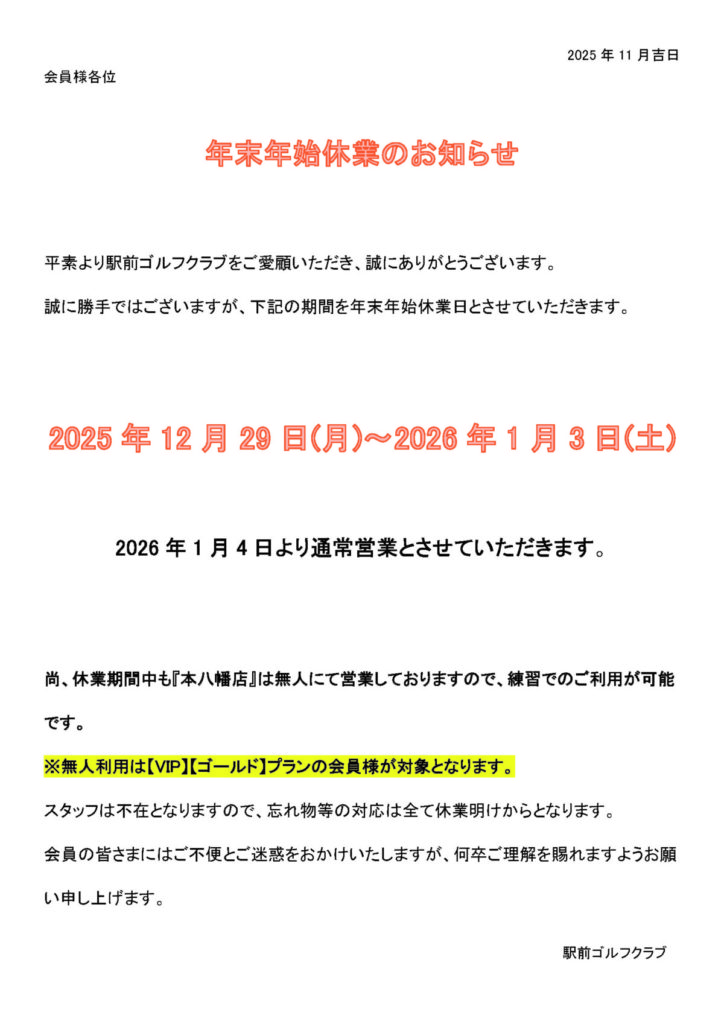 年末年始休業のお知らせ