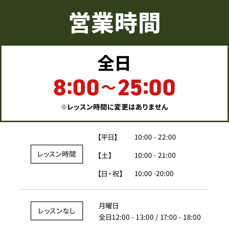 レッスン時間には変更ありませんが、無人営業時間を拡大し、会員の皆様にこれまで以上にご利用していただきやすくなりました。